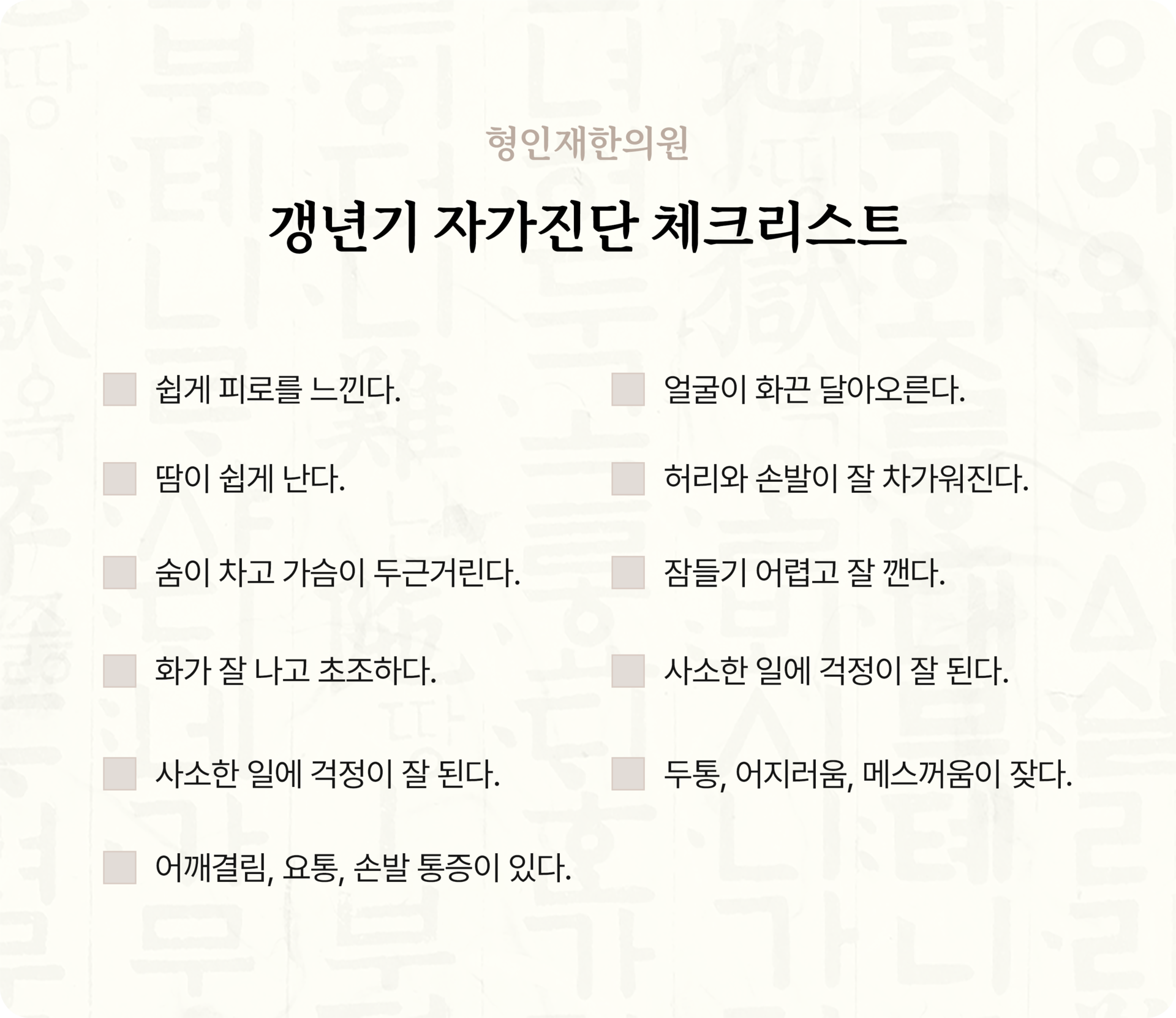 아래 항목 중 3가지 이상에 해당하면 갱년기 증후군을 의심해 볼 수 있습니다.